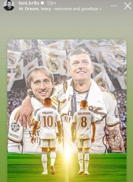 在社交媒体上,克罗斯晒出了自己和莫德里奇、姆巴佩和巴尔韦德的特效合成图,并写道:梦想和荣耀,欢迎和告别!